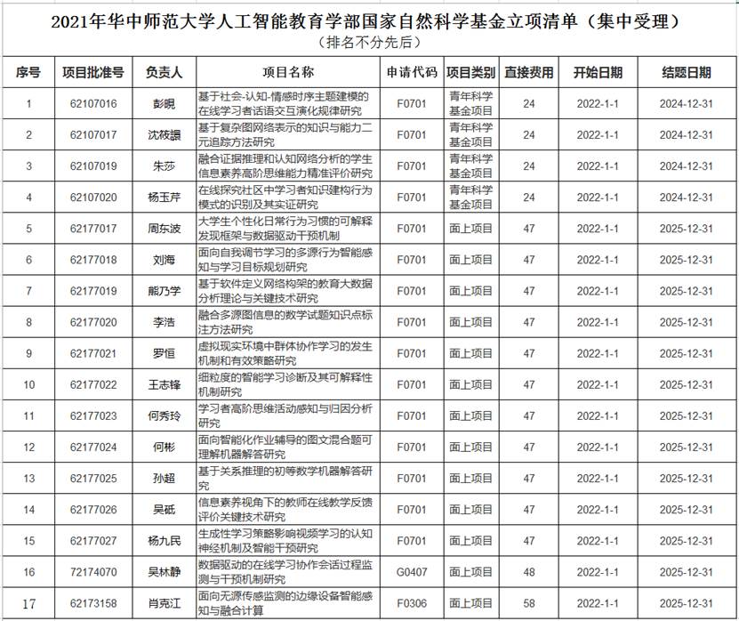 人工智能教育学部讯(通讯员 孔庆鹏)近日,国家自然科学基金委员会公布了《关于2021年国家自然科学基金集中接收申请项目评审结果的通告》,人工智能教育学部获批项目数及资助经费数在校内均名列前茅,共有17项申请获得资助,占全校立项总数近20%;获直接经费资助719万元,占全校获批直接经费近17%。