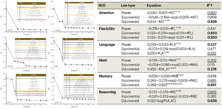 模拟实验结果表明,该方法能够在一定噪声范围内准确识别核心变量并重建预设的技能习得规律方程,验证了所提方法的有效性。在大规模真实认知技能训练数据的应用中,通过该方法发现的技能习得规律在适应度、拟合度等指标上显著优于传统和当前主流学习模型。同时,通过该方法从数据中发现了两类新的认知技能习得规律(对数率与反幂率),并验证了多项先前的研究发现。
