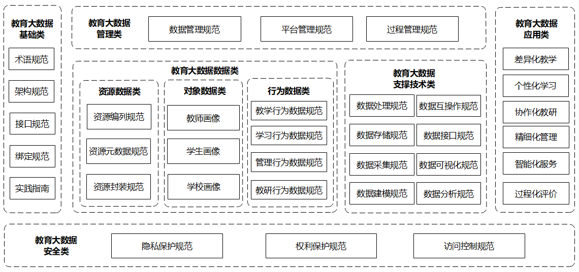 针对教育大数据非结构化、分布式、异构性、来源分散等特点,在学习科学和教育教学相关理论的指导下,制定一系列教育大数据标准,形成教育大数据标准体系。教育大数据标准体系由基础类、资源数据类、对象数据类、行为数据类、支撑技术类、管理类、应用类和安全类标准组成。