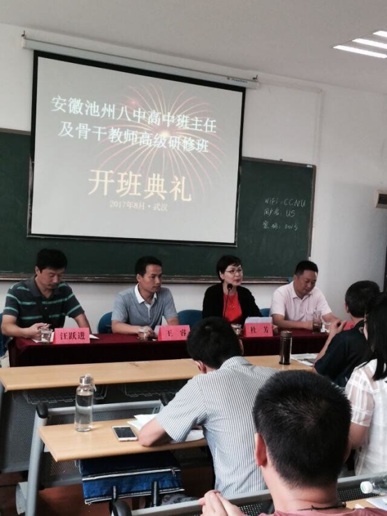 2017年8月1日至6日,安徽省池州八中高中班主任及骨干教师高级研修班在华中师范大学成功举办。8月2日上午,本次研修班开班仪式在华中师范大学教师教育学院B504教室举行,安徽池州八中校办室主任王睿、安徽池州八中教导副主任曹君、安徽池州八中教导副主任汪跃进、华中师范大学职业与继续教育学院培训部主任杜芳出席了开班仪式。