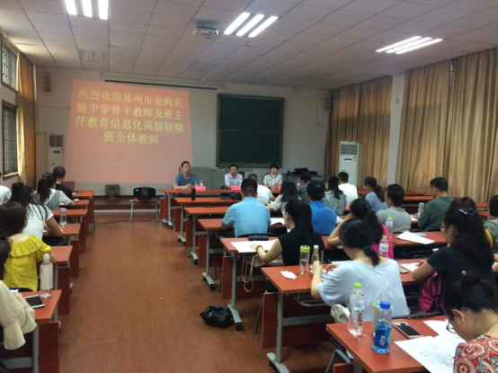 2017年8月18日至8月21日,苏州市金阊实验中学骨干教师及班主任教育信息化高级研修班在华中师范大学成功举办。8月19日上午,本次研修班开班仪式在华中师范大学研究生院一楼报告厅举行,华中师范大学国家数字化学习工程技术研究中心副部长马兰、苏州市金阊实验中学校长陈荔等出席了开班仪式。