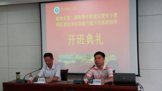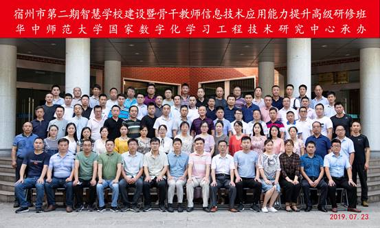 2019年7月22日至7月26日,宿州市第二期智慧学校建设暨骨干教师信息技术应用能力提升高级研修班在华中师范大学成功举办。7月23日上午,本次研修班开班仪式在华中师范大学科学会堂201室举行,宿州市教体局电教馆主任曹开国、国家数字化学习工程技术研究中心副主任吴绍靖出席了开班仪式。
