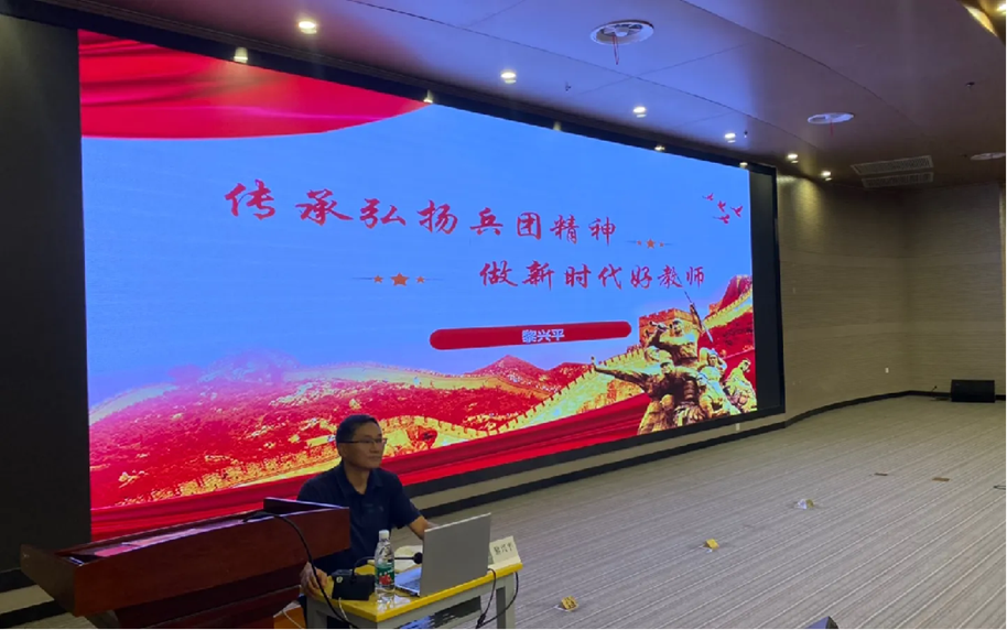 在开班典礼之后,兵团教育局领导黎兴平为我们带来了《传承弘扬兵团精神,培养新时代戍边人》的精彩讲座。黎局长结合教育教学解读了兵团精神的内涵及时代意义。深刻细致地解读了兵团精神、胡杨精神、老兵精神。兵团精神的内涵从四个方面展开:首先,热爱祖国是核心,是兵团精神的伟大灵魂;无私奉献是兵团精神的永恒价值;艰苦创业是兵团精神的高尚品格;开拓进取是兵团精神的不懈追求。