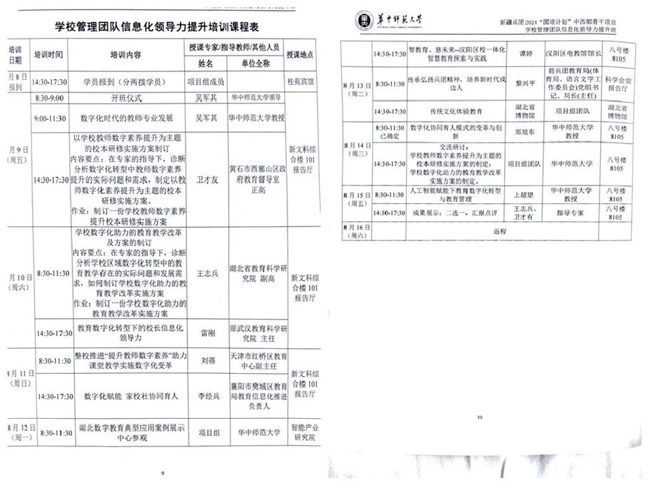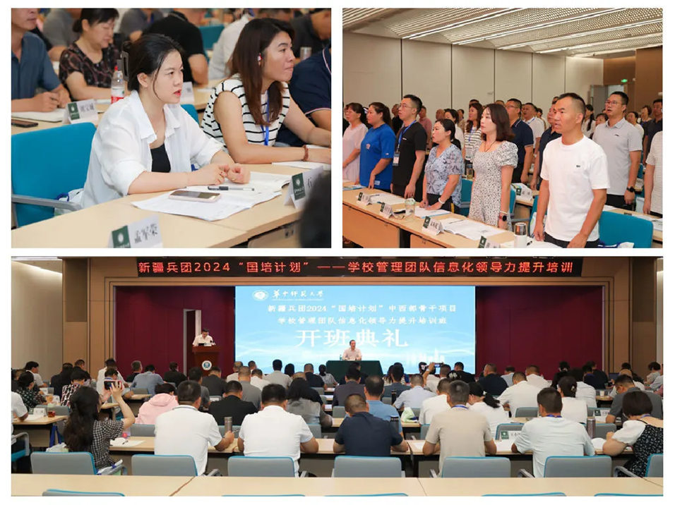 2024年8月9日,由新疆兵团教育局主办,华中师范大学承办的新疆兵团“国培计划(2024)”学校管理团队信息化领导力提升培训班在华中师范大学顺利开班。来自新疆兵团各中小学的100名校长及主管信息化副校长齐聚华中师范大学新文科综合楼101会议室隆重举行开班仪式,华中师范大学相关部门领导及培训班班主任、授课专家出席了仪式,开启了为期一周的学习之旅。