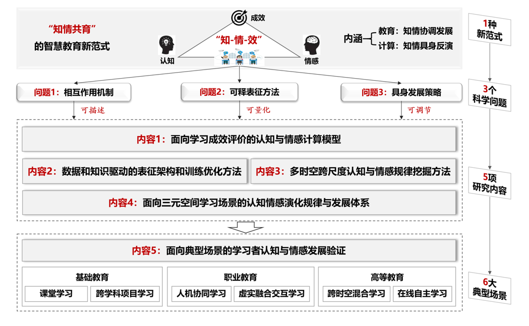 项目针对当前学习者认知与情感计算面临的机理不明晰、知识难表达、策略难迁移等挑战,重点研究“物理-社会-信息”三元空间学习环境下“认知-情感-成效”相互作用机制、可释表征方法与具身发展策略等问题,旨在建立支持学习主体智能计算与适性调节的理论框架和技术体系,助力发展“知情共育”的智慧教育。