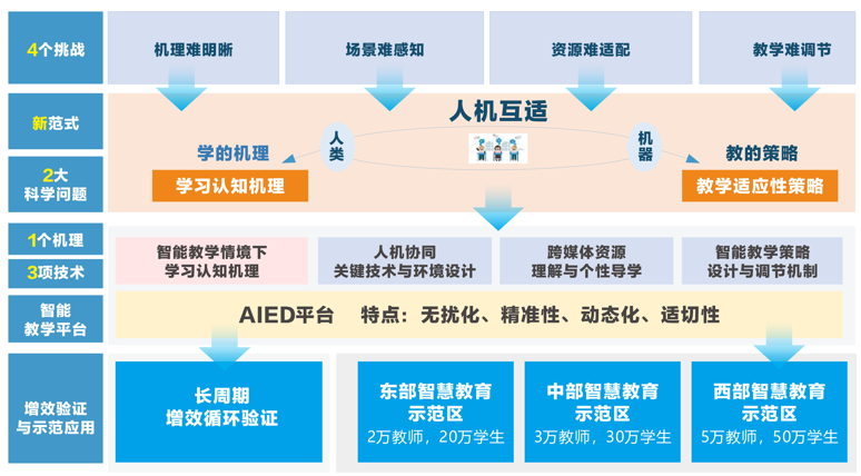 项目针对人机协同教学环境下的学习认知机理与适应性策略的科学问题,开展智能教学情境下的学习认知机理、人机协同关键技术与环境设计、跨媒体资源理解与个性化导学、智能教学策略设计与调节机制、智能教学平台构建与示范应用五个课题研究,建立具有国际先进水平的人机协同智能教学平台。