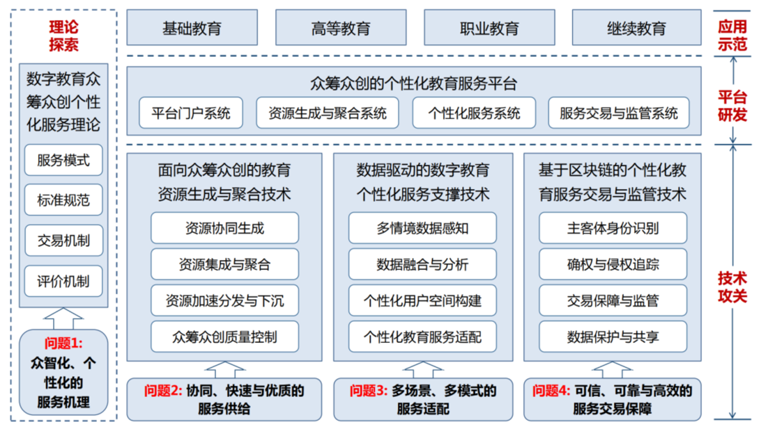 项目以促进教育资源供给侧及个性化教育服务模式创新为导向,以众智科学、大数据、区块链等新一代信息技术作为创新驱动力,探索建立众筹众创的数字教育个性化服务理论体系。