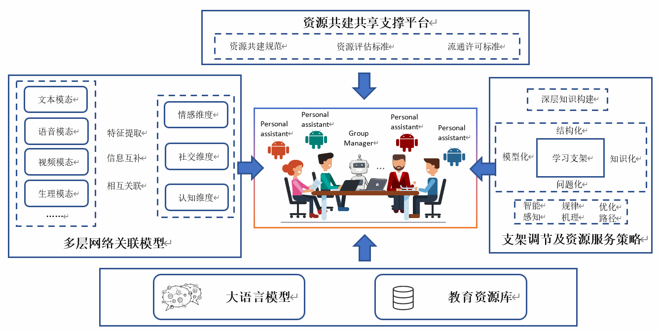 项目针对群体协作学习过程学习效率提升与智能服务支持等核心问题,揭示群体协作过程中情感-社交-认知演化规律及作用机理,挖掘典型模式并分析成效归因,建立情感-社交-认知多层网络关联模型;研究基于多源多模态数据信息互补的动态评测方法,基于大模型推理的学习情感调节策略、面向群体协作的路径优化策略,以及面向深层知识构建的支架调节及资源服务策略;研究相关资源共建共创协同机制,构建资源共建共享支撑平台;进而,构建基于智能体协作的人机共生智能协作支撑服务系统。